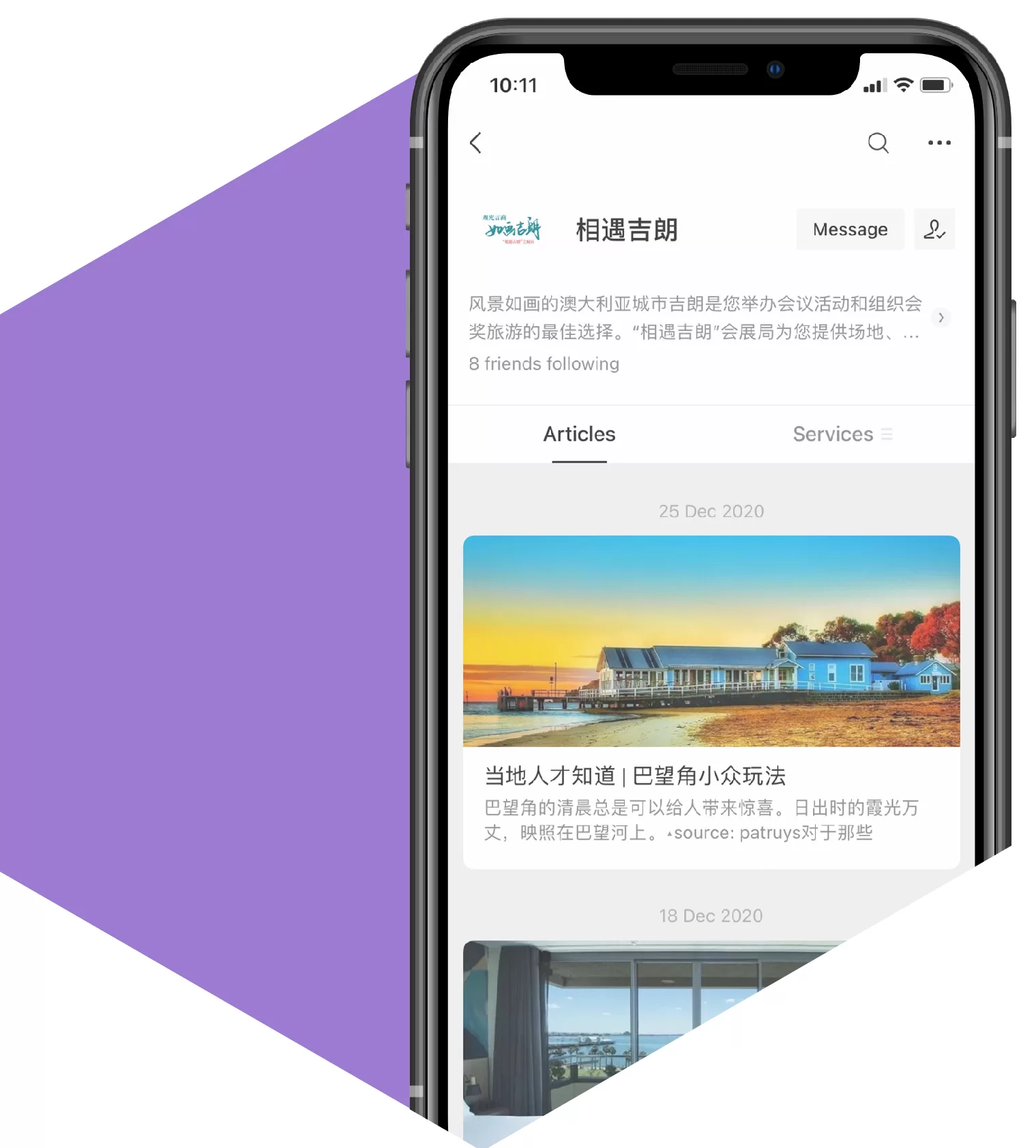 If you set up your own WeChat account, that is normally a personal account that you use to chat to others. A subscription account or a service account is equivalent to a Facebook Page where you can publish information to your followers. Subscription accounts are commonly used by media or influencers, whereas service accounts are used by businesses. At this stage, Australian companies can only register for service accounts. The benefit is that your message will pop up in the same way as a friend’s chat so your followers won’t miss a message, but the limitation is that it only allows 4 posts (each post can include up to 8 articles) per month.